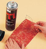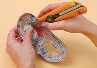 Vágjuk ki az álarcformát PVC lemezből (a mintát alkoholos filccel rajzoljuk fel; a vonalat a szabás után lemossuk). A csomagolópapírból akkora téglalapot vágjunk, amelyre bőven elfér a maszk; mindkettőt helyezzük egy újságpapírra. Fújjuk le a PVC-t ragasztóspray-vel, és 10-20 másodperc után helyezzük a csomagolópapírra és jól préseljük rá. Vágjuk le körben a fölösleges papírt, a szemnyílást sniccerrel szabjuk ki.