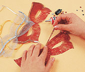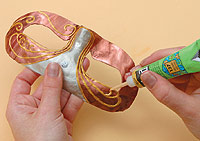 Lyukasszuk ki az álarcot a két szélén, fűzzük be a szalagot (ha nehezen fér be, egy vékony drótdarabot hajlítsunk félbe, ezt húzzuk át a lyukon, és mint tűvel a cérnát, ezzel húzzuk át a szalagot). Ragasszuk fel a flittersort.