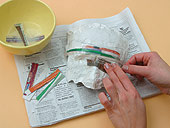 A megszáradt öntvényen ceruzával jelöljük be, hogy milyen formájú maszkot szeretnénk. Kenjük be az öntvényt zsíros krémmel, vazelinnel, hogy ne ragadjon rá a papírmasé. Készítsünk sűrű tapétaragasztós oldatot. Az újságpapírt vágjuk 1-1,5 cm-es csíkokra. Ezeket ragasztóba áztatva kezdjük el felrakosgatni a formára mindig jól rásimítgatva. Legalább öt-hat réteget rakjunk váltakozva keresztben és hosszában.