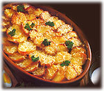 A burgonyát héjában megfőzzük, még melegen meghámozzuk, és ha kihűlt, karikákra vágjuk. A házisonkát apró kockákra daraboljuk. A tejfölt a tejszínnel, a tojássárgájával, a sóval és az őrölt borssal összekeverjük, majd hozzáadjuk az előkészített burgonyát és a sonkát. Tűzálló edényt a vajjal vagy margarinnal kikenjük, kevés zsemlemorzsával megszórjuk, és a keveréket beleöntjük, tetejére morzsoljuk a maradék zsiradékot, és előmelegített sütőben megsütjük. Önálló ételként vagy köretként adhatjuk. Tetejét ízlés szerint reszelt sajttal is megszórhatjuk.