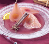 A narancsot alaposan megmossuk, héját lereszeljük, levét kifacsarjuk. A körtéket meghámozzuk, kettévágjuk, magházukat kiemeljük. A bort a narancs héjával és levével felforraljuk, belekeverjük a fahéjat. A körtéket a borba fektetjük, felforraljuk, és 7-10 perc alatt puhára főzzük. A körtéket tálkákba szedjük, kihűtjük. A keményítőt elkeverjük kevés vízzel, a vörösboros léhez adjuk, egyet forralunk rajta, és édesítőporral édesítjük. A szirupot a körtékre öntjük, és tálaljuk.