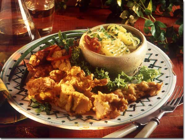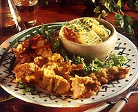 Közben a kolozsvári szalonnát és a vargányagombát kockára vágjuk. A szalonnát megpirítjuk, hozzáadjuk a gombát, sóval, törött borssal, morzsolt kakukkfűvel fűszerezzük. Amikor az anyagok lepirultak, hozzászűrjük a csirke leszűrt pecsenyelevét, az anyagokat jól összeforraljuk, majd belekeverjük az olajban megsütött, apró kockákra vágott burgonyát. A feldarabolt csirkét tálra rakjuk, és közé öntjük a ragut. Zöldsaláta levéllel díszítjük.