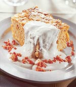 A kockatésztát kifőzzük, leszűrjük. A tojássárgákat zsírral habosra keverjük. Hozzákeverjük a tejfölt, sózzuk, borsozzuk. A durvára őrölt főtt sonkát beletesszük, hozzákeverjük a tojások keményre vert habját, majd belekeverjük a főtt, kissé lehűtött tésztát és kizsírozott, morzsázott tepsibe öntjük. Közepes hőfokon világos pirosra sütjük. Kockára vágva forrón tálaljuk.