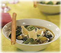 Beletesszük a leöblített és jól lecsöpögtetett spenótleveleket, meghintjük szerecsendióval, és még 3 percig kislángon főzzük. A zöldségeket elosztjuk a tányérokon, majd rámerjük a levest, és mindegyikre néhány sajtforgácsot teszünk.