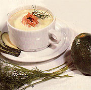 Az avokádót megtisztítjuk, a húsát felszeleteljük. A vöröshagymát és a sonkát finomra vágjuk. A vajat megolvasztjuk, beletesszük a vöröshagymát és megfonnyasztjuk, majd hozzátesszük a szeletelt avokádót, sózzuk, borsozzuk és együtt majdnem puhára pároljuk. Felöntjük 8 dl vízzel vagy húslevessel, és lassú forralással puhára főzzük. Az egészet szitán áttörjük vagy turmixgépben egyneműsítjük. A tejszínt a liszttel csomómentesre keverjük, és a lángra visszatett levesünket besűrítjük. Tálaláskor a csésze aljára tesszük a sonkát, rámerjük a forró levest, és kaporral díszítjük.