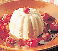 A tejszínt három részletben habbá verjük. 12 cseresznyét lecsöpögtetünk, és apróra vágjuk. Vízgőzben a tojássárgákat felverjük a cukorral, és állandóan kevergetve, kislángon sűrűre főzzük. Levesszük a tűzről, kihűlésig keverjük, így kétszeres mennyiségű habot kapunk. Belekeverjük az apróra vágott cseresznyét és a tejszínhabot. 4 darab 1,5 dl-es pudingformába osztjuk a krémet, és 12 órára hűtőbe tesszük. A szószhoz a tejszínt, a porcukrot és az áttört málnát habbá verjük. A parfét desszertestányérok közepére borítjuk, majd a szósszal körülöntjük. Cseresznyével, málnával díszítjük.