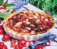 A cseresznyét kimagozzuk, a cukorral, a citromlével, a keményítővel, a fahéjjal és a mandulaaromával elkeverjük. 22 cm átmérőjű, cakkos szélű tortaformát kivajazunk, és liszttel meghintünk. Zsírpapírt teszünk bele, belerakjuk a tortalapot, és rászórjuk a cseresznyés keveréket. A torta szélét felvert tojással megkenjük, majd meleg sütőben megsütjük. A sütés vége előtt 5 perccel a mandulaforgáccsal megszórjuk. Langyosan vagy hidegen tálaljuk. Reszelt citromhéjjal ízesített édes tejszínhabot kínálhatunk mellé.