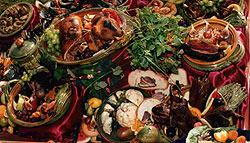 A fiatal liba, kacsa, a kappan, fácán, fogoly, seregély, melyek nagy számmal vannak errefelé, aztán borjú-, bárány-, gödölye-, disznó és vaddisznóhús meg mindenféle hal a maga külön mártásában úszik és fűszereződik.