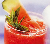 A dinnye belét villával áttörjük, és néhány órára hűtőbe tesszük. A vizet és a cukrot egy kis edényben felmelegítjük, hogy a cukor elolvadjon, majd hagyjuk teljesen kihűlni. A dinnyét és a szirupot összekeverjük, majd hozzáadjuk a citromok levét. Poharakba töltjük, dinnyeszeletkékkel és mentalevelekkel díszítjük.