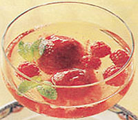 A málnát megmossuk, leszárítjuk, néhány szemet félreteszünk, a többit pürésítjük, és leszűrjük. A pürét a citromlével és a porcukorral kikeverjük, majd 2-3 órára a fagyasztóba tesszük. Apró gömböket teszünk egy pezsgőspohárba, ráöntjük a lehűtött pezsgőt, beletesszük a málnaszemeket, és mentalevéllel díszítjük.
