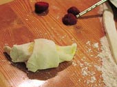 A leveles tészta receptjét inkább nem írjuk le, mert nem valószínű, hogy valaki nekiállna ilyet hajtogatni, amikor a mélyhűtött is remekül megfelel. Nyújtsuk ki a tésztát kb. 4 mm vastagra, vágjunk belőle hosszú háromszögeket és kenjük meg őket felvert tojással. Tegyünk rájuk egy-egy szem epret és süssük ki. Pasta Frolla A pasta frolla egy kevert tészta, amely jó alapja gyümölcstortáknak, gyümölcskosaraknak.