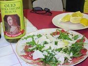 A tetejét 500 gr rucola és kb. 10 dkg darabolt parmezán díszítette. Ekkor kellett fűszerezni is, citrommal, olívaolajjal, sóval és frissen darált borssal.