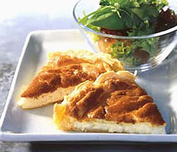 A felengedett tésztát kinyújtjuk, majd a kivajazott sütőformába simítjuk, villával megszurkáljuk, és 15 percre hűtőbe tesszük. Serpenyőben megolvasztjuk a vajat, állandóan kevergetve hozzáadjuk a tejfölt, a lisztet, a sajtot, a szerecsendiót, megsózzuk, megborsozzuk, és addig kevergetjük, amíg a sajt megolvad, a krém pedig sűrűsödni kezd. Levesszük a tűzről, tálba öntjük, és hűlni hagyjuk. A tojásfehérjéből kemény habot verünk, és hozzáadjuk a krémhez. A keveréket a hűtőből kivett tésztára öntjük, és forró sütőben 25 percig sütjük. Hidegen és melegen is tálalhatjuk.