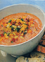 A Tabascót Erős Pistával helyettesíthetjük. Tálaljuk csészében, a maradék felkockázott zöldséggel és bazsalikommal fűszerezve! Ha nem diétázunk, magvas kenyeret kínálhatunk mellé.