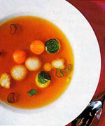 A zöldségeket megtisztítjuk (a hagymát nem hámozzuk meg!), majd a marhahússal, a csonttal és a csirkeaprólékkal együtt, sóval, borssal ízesített vízben lassú forrással húslevest főzünk. Leszűrjük, és a zöldségeket kihűtjük. A darált húst, a tojásfehérjét és a paradicsompürét fél liter vízzel simára keverjük. Apránként hozzáöntjük a már kész, leszűrt levest, és kislángon még legalább 1 órát főzzük. Közben a kihűlt zöldségekből karalábévájó segítségével golyókat készítünk. Az elkészült levest vászonkendőn leszűrjük, tetejéről leszedjük a zsírt. Ezután hozzáadjuk a konyakot és a zöldséggyöngyöket, és kihűtve tálaljuk.