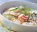 A csirkehúst vastag szeletekre vágjuk, és gőzben puhára főzzük. A húst, a citromlét és 2 csipetnyi sót salátástálban összekeverünk, majd folpackkal lefedjük, és hűtőben 1 órát állni hagyjuk. A retkeket és az uborkát vékonyan felkarikázzuk. Salátástálban simára keverjük a tejfölt az ecettel és csipetnyi sóval. Hozzáadjuk a húst, az uborka- és a retekkarikákat, 2 kávéskanál durvára tört színes borsot és a snidlinget. Frissen tálaljuk.