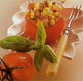 Egy serpenyőben forrósítsuk fel az olajat, és tegyük bele a hagymát. Süssük, amíg átlátszó lesz. Egy tálban keverjük össze a hagymát a többi hozzávalóval, kivéve a paradicsomot. A keveréket töltsük a paradicsomokba. Süssük előmelegített forró sütőben 15 percig.