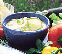 Az olajban megpároljuk az apróra vágott hagymát és a zúzott fokhagymát, majd hozzáadjuk az őrölt fűszereket és 4 dl vizet. Összekeverjük, felforraljuk, sóval ízesítjük, és 15 percig főzzük. A csirkemellet hosszú, vékony szeletekre vágjuk, a levesbe tesszük a felkockázott uborkával és padlizsánnal, és 25 percig főzzük. A tésztát sós vízben kifőzzük, és a főzés vége előtt 5 perccel a leveshez adjuk. A tűzről levéve citromlével ízesítjük, korianderrel megszórva, citromkarikákkal díszítve tálaljuk.