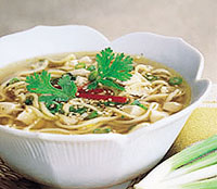 A gyömbért meghámozzuk, és vékonyan felszeleteljük. A fokhagymát kettévágjuk. A metélőhagymát apróra vágjuk. A húslevest lábasba öntjük, beletesszük a csirkehúst, felforraljuk, 10 percig kislángon főzzük, közben a keletkező habot eltávolítjuk. Beletesszük a fokhagymát, a gyömbért, a szemes borsot, sót, 1 evőkanál apróra vágott metélőhagymát, és 40 percig forraljuk, közben a habot leszedjük. A húst kivesszük, langyosra hűtjük, és felkockázzuk. A paprikát hosszú, vékony szeletekre vágjuk. A szezámmagot teflonban megpirítjuk. A húslevest áttörjük, hozzáadjuk a húst, és újból felforraljuk. Beletesszük a tésztát, 5 percig főzzük, majd kislángra téve hozzáadjuk a maradék metélőhagymát, a szójaszószt, és felforraljuk. Levesestálba öntjük. Mellétesszük a paprikát, a koriandert és a szezámmagot, hogy mindenki ízlése szerint fűszerezhesse az ételt.