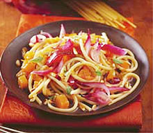 Hozzáadjuk a sütőtökkockákat, megsózzuk, és további 5 percig pároljuk. Kis serpenyőben megpirítjuk a fenyőmagot (vagy a darabolt mandulát), majd a leszűrt, lecsöpögtetett tésztát tálba öntjük, összeforgatjuk a hagymás-sütőtökös mártással. Belekeverjük a mazsolát és a fenyőmagot, meghintjük majoránnával, őrölt borssal, és azonnal tálaljuk.