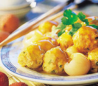 A hagymákat és a csirkehúst kis kockákra vágjuk, majd a gesztenyével együtt turmixoljuk. Salátástálba öntjük, belekeverjük a keményítőt, a tojásfehérjét, a szójaszószt és a sherryt. Sóval, borssal megszórjuk, összegyúrjuk, és 3 cm átmérőjű golyókat formázunk belőle. A szószhoz a licsiszirupot a húslevessel, a szójaszósszal és a feloldott keményítővel összekeverjük, és kevergetve felforraljuk, míg sűrű lesz. A licsiket beletesszük, lefedjük, és levesszük a tűzről. Az olajban aranysárgára sütjük, majd papírtörlőre szedjük. A licsiszósszal meglocsolva, korianderrel díszítve tálaljuk. Párolt rizst kínálhatunk mellé.