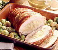 1. A kelbimbót megtisztítjuk, a hagymát apróra vágjuk. A kenyeret 10 percre a tejbe áztatjuk. A meghámozott, kimagozott almát kisebb darabokra vágjuk. A húson óvatosan „zsebet” vágunk, de vigyázzunk, hogy ne metsszük át, és a szélein is ujjnyi vastag rész maradjon. A hagymát 3 dkg vajban üvegesre pirítjuk, hozzáadjuk a beáztatott kenyeret, az almadarabokat, és a gesztenyemassza negyedét. Sóval, borssal ízesítjük, és összekeverjük. Ezzel a húst megtöltjük. Az egészet szalonnaszeletekkel beborítjuk, és cérnával átkötjük.