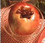 Vágjuk ketté az almákat, a magházat vájjuk ki úgy, hogy kisebb mélyedést kapjunk. A diót vagdaljuk apró darabokra, a mazsolát áztassuk be rumba. A magház helyére locsoljunk citromlevet, majd béleljük ki a dióval elkevert mazsolával. Kanalazzunk rá egy kis mézet, végül illesszük össze az almák két felét. Tegyük őket forró sütőbe, és süssük addig, amíg nem kezdenek el fonnyadni.