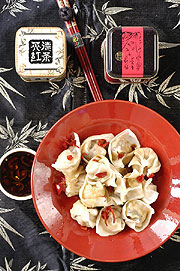 Míg megfőnek, elkészíthetjük a szószt. 4 kis tálkában fokhagymát, szójaszószt, egy csipet cukrot és fahéjat keverünk el, azaz mindegyik adaghoz külön előkészülünk, egyenlően elosztva a hozzávalókat. A megfőtt gombócokat elosztjuk a szószos tálakban, majd lelocsoljuk egy-egy evőkanál chiliolajjal. Díszítésként apróra vágott újhagymával szórjuk meg.