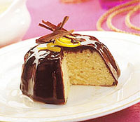 A mázhoz a csokoládét vízgőzben megolvasztjuk, egy adaggal mindenhol meglocsoljuk a felfújtat. 5 percre ezt is fagyasztóba rakjuk, hogy teljesen megdermedjen. Ezt a műveletet addig ismételjük, míg a csoki elfogy. Hidegen, de frissen tálaljuk, az öntetet külön kínáljuk hozzá.