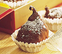 Teflonban világosra pirítjuk a mandulát. Kihűtjük, majd ujjaink között szétmorzsoljuk. Vízgőz felett megolvasztjuk a csokoládét, hozzáadjuk a tejszínt, a szétmorzsolt hideg margarint, a mandulát, és óvatosan összekeverjük. A fügéket széltükben kettévágjuk, és kávéskanál segítségével a belsejükbe töltjük a krémet. Ujjainkkal addig formázzuk a fügéket, amíg eredeti, aszalás előtti alakjukat visszanyerik. A tetejüket visszatesszük, mindegyiket kakaóba forgatjuk, és minyonpapírokra tesszük. Porcukorral megszórjuk, és 15 percre hűtőbe tesszük.