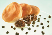 Gyúrjunk puha masszát a lisztből, a sóból, az élesztőből, a vízből, és hagyjuk pihenni körülbelül két órán át. Közben dolgozzuk össze az apróra vágott kapribogyót a kis paradicsomokkal, a kimagozott olajbogyóval, az erős paprikával és a hagymával. A masszát keverjük hozzá a megkelt tésztához, szaggassunk belőle kis labdákat, és forró olajban süssük ki.