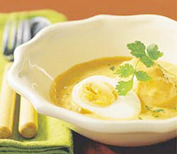 A tojásokat hosszában kettévágjuk. A hagymákat finomra vágjuk, a gyömbért meghámozzuk, és vékonyan felszeleteljük. Nagy serpenyőben, forró vajban, kislángon megfuttatjuk a hagymát, a fokhagymát és a gyömbért. Meghintjük kurkumával meg cayenne borssal, és további 30 percig nagylángon pároljuk. Fokozatosan hozzáadjuk a kefirt meg a paradicsomot, megsózzuk, és jól összekeverjük. Beletesszük a fél tojásokat, és úgy forgatjuk, hogy a mártás befedje őket. Lefedjük, és 10 percig kislángon főzzük. Meghintjük korianderrel, és még 5 percig pároljuk, aztán levesszük a tűzről, és azonnal tálaljuk.