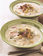 2. A leves felét turmixgépben pürésítsük, majd öntsük vissza a lábosba. Keverjük hozzá a tejet, és lassan melegítsük fel. Adjuk hozzá az ecetet. Tálalás előtt szórjuk a levesbe a sonkadarabokat.