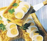 A pizza tésztaporból, vízből, 2 evőkanál olajból a tasakon található leírás szerint tésztát készítünk, bekenjük 1 evőkanál olajjal, letakarjuk, és meleg helyen fél óráig kelesztjük. A szardellafilét leöblítjük, és nagyobb darabokra vagdaljuk, a hagymát felaprítjuk. Serpenyőben, 2 evőkanál forró olajban, kislángon megfuttatjuk a szardellát, hozzáadjuk a hagymát. Állandóan kevergetve megfonnyasztjuk, majd beletesszük a kakukkfüvet, a zúzott fokhagymát, és 2 evőkanál vízzel felöntjük. Gyakran kevergetve 15 percig pároljuk. A pizzatésztát téglalap alakúra nyújtjuk, és tepsibe nyomkodjuk. Rákenjük a hagymás szardellakrémet, és meglocsoljuk a maradék 1 evőkanál olajjal, majd 15 percre forró sütőbe toljuk. A tojásokat tojásszeletelővel egyforma szeletekre vágjuk, majd a frissen sült pizza tetejére rakjuk. Azonnal tálaljuk.