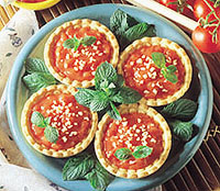 A lisztbe mélyedést készítünk, és hozzáadjuk az előzőleg langyos vízzel felfuttatott élesztőt. Hozzákeverjük az olajat, a gyömbért, a sót, és annyi langyos vizet, hogy fánktészta sűrűségű tésztánál kicsit keményebb legyen. Letakarva megkelesztjük, majd kis formákba simítjuk a tésztát. A paradicsomokat leforrázzuk, meghámozzuk, turmixgéppel pürésítjük, és kevés vízzel kiforraljuk. A fűszerekkel és sóval ízesítjük, majd ismét kiforraljuk. A mártást a tésztákra adagoljuk, megszórjuk apró kockákra vágott mozzarellával, és megsütjük.