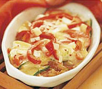 Hozzáadjuk a paradicsomkarikákat, a finomra vágott kakukkfüvet, 1 kávéskanál pirospaprikát, és 10 percig kislángon pároljuk, majd sütőtálba öntjük. Váltakozva rárakjuk a paprikát és a cukkinit, befedjük a sajtkockákkal, megszórjuk a maradék pirospaprikával, meglocsoljuk a maradék olajjal, és 10 percre forró sütőbe toljuk. Roston sült sertés-, marha- és szárnyashúsokhoz kínáljuk.