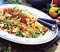 Beleöntjük a levest, sóval, borssal ízesítjük, a pirospaprikával és a sáfránnyal megszórjuk. Összekeverjük, felforraljuk, és 10-12 percig főzzük, időnként megkeverjük. Amikor a rizs megpuhult, hozzáadjuk a zöldborsót, és lefedve még 5 percig főzzük. Újrafűszerezzük, majd a paradicsomkockákkal és a petrezselyemmel megszórva, melegen tálaljuk.