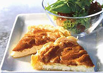 A felengedett tésztát kinyújtjuk, majd a kivajazott sütőformába simítjuk, villával megszurkáljuk, és 15 percre hűtőbe tesszük. Serpenyőben megolvasztjuk a vajat, állandóan kevergetve hozzáadjuk a tejfölt, a lisztet, a sajtot, a szerecsendiót, megsózzuk, megborsozzuk, és addig kevergetjük, amíg a sajt megolvad, a krém pedig sűrűsödni kezd. Levesszük a tűzről, tálba öntjük, és hűlni hagyjuk. A tojásfehérjéből kemény habot verünk, és hozzáadjuk a krémhez. A keveréket a hűtőből kivett tésztára öntjük, és forró sütőben 25 percig sütjük. Hidegen és melegen is tálalhatjuk.