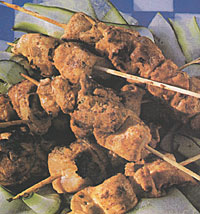 2. Melegítsük elő a grillt közepes hőfokra. Csöpögtessük le a csirkecombokat, és három darabonként fűzzük fel enyhén megolajozott nyársakra. Ismételjük a műveletet a maradék combokkal, hogy négy nyársat kapjunk. Helyezzük a kebabokat az enyhén megolajozott grillrácsra, és süssük oldalanként 4-5 percig, illetve amíg a csirke puhára sül.