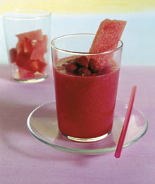 Az epret megtisztítjuk, és az almalé egyharmadával, a citromlével és a dinnyehús nagy részével összeturmixoljuk. 4 pohárba öntjük a sűrű gyümölcslét, kiegészítjük a maradék almalével, ízlés szerint jégkockákat teszünk bele, és a maradék dinnyéből készült dinnyehasábokkal díszítve kínáljuk.