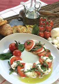 A mozzarella lágy, sima állagú sajtféleség, amelynek eredeti olasz változatát bivaly tejéből gyártják, ezért ez teljesen más ízű, mint különféle minőségű, tehéntejből készült változatai, amit például Magyarországon is készítenek. A krémfehér vagy elefántcsontszínű, friss tejes zamatú mozzarella úgy készül, hogy a túrót felhevített savóval keverik össze, majd addig nyújtják és gyúrják, amíg egyenletesen lágy, rugalmas masszát kapnak. Ekkor gömb alakú vagy ovális formákba préselik, és vízben tárolják, hogy ki ne száradjon. A mozzarellát sok helyen mindennap frissen készítik. A mozzarellát ujjnyi vastag szeletekre vágjuk, ily módon szeleteljük fel a paradicsomot is. Körberakjuk a tányért velük felváltva, majd megszórjuk friss bazsalikommal a tetejét, kevés olívaolajjal meglocsoljuk. Ízlés szerint balzsamecettel is ízesíthetjük. Mellé pirítóst vagy crostinit fogyasszunk. |
