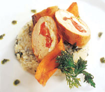 A pulykamelleket kissé kiveregetjük, és csak kissé sózzuk, mert a sajt eleve eléggé sós. A paradicsomot meghámozzuk, és felkarikázzuk. A sajtot felkockázzuk, és a paradicsommal együtt a pulykamellek közepére tesszük, majd a húst felgöngyöljük. Olajozott alufóliába tekerjük, és serpenyőben, kislángon 15 perc alatt megsütjük. A tekercseket közben többször megforgatjuk. (Így biztosan nem folyik ki belőle a sajt, és még szaftos is marad a pulykahús.)
