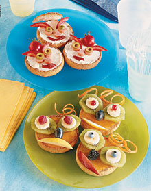 Az édes pofa: a maradék kétszersülteket megkenjük a lekvárral, a szemüket kivi- és banánkarikákból, valamint málnából vagy más bogyós gyümölcsből készítjük. Az orrukat szederből, illetve szőlőszemből, a szájukat almagerezdből, a hajukat pedig vékony csíkra vágott citromhéjból formázzuk.