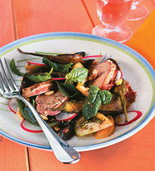 A spenótleveleket és a paradicsomot folyó vízzel alaposan megmossuk, ha szükséges, a parajt apróbbra tépkedjük, a paradicsomot cikkekre vágjuk. Megmossuk a retket is, és vékony karikára szeleteljük. Mély tálba 4 ek. olajat öntünk, citromlével, az apróra vágott mentalevelekkel, sóval, borssal jól összekeverjük. A fenyőmagot (mandulát) száraz serpenyőben egy kicsit megpirítjuk. Négyfelé osztjuk a zöldséget, a felszeletelt sült húst, a fenyőmagot, és meglocsoljuk a fűszeres olajjal.