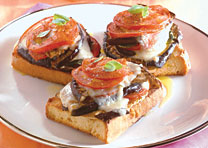 A kenyérszeleteket félbevágjuk, és megpirítjuk, vagy 180 fokosra előmelegített sütőbe tesszük pár percre. A padlizsánt megmossuk, vékonyan felszeleteljük, kicsit besózzuk, és rövid ideig pihentetjük, hogy a levét kiengedje. A mozzarellákat és a megmosott, lecsumázott paradicsomokat közepesen vastag szeletekre vágjuk, a bazsalikomot 8 levélke kivételével felaprítjuk. A padlizsánszeleteket papírtörlővel szárazra töröljük, és teflon serpenyőben, kevés olajban kisütjük. A kenyérszeleteket vékonyan megkenjük olívaolajjal, ráhelyezünk egy padlizsánszelet, egy mozzarellaszeletet és egy paradicsomot sorban, míg a hozzávalók tartanak. Közüket megszórjuk az apróra vágott bazsalikommal. A tetejüket meghintjük frissen őrölt borssal, és a megpúpozott kenyérkéket betoljuk a sütőbe, addig, míg a sajt ráolvad a padlizsánra. Melegen tálaljuk, a félretett bazsalikommal díszítjük.