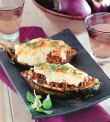 Hosszában elfelezzük a padlizsánokat, húsukat keresztben bevágjuk, és kislángon serpenyőben, az olajban 5-6 percig sütjük a bemetszett oldalára fordítva. Kihűtjük, majd kanállal kiemeljük a húsát, de vigyázzunk, hogy a héja ne sérüljön meg! Az apróra vágott hagymát 2 ek. olajban üvegesre pároljuk. Hozzátesszük a húst, majd 3-4 perc múlva a padlizsán kikapart húsát is. Ízesítjük a konyakkal, a fűszerekkel, beletesszük az edénybe a paradicsomot is, sózzuk, borsozzuk és még 2 percig főzzük. Közben besamelt készítünk: a vajban világosra pirítjuk a lisztet, felöntjük a tejjel, és állandóan kavargatva 4-5 percig főzzük. Ezután beletesszük a besamelbe a sajt felét, fél citrom levét és csipetnyi reszelt szerecsendiót. Kicsit hűlni hagyjuk, majd belekeverjük a tojást. A padlizsánhéjakat felváltva megtöltjük a húsos zöldséggel és a besamellel. Tetejükre húsos massza kerüljön, amit lefedünk a megmaradt sajttal. Sütőpapírral vagy alufóliával beborítva 220 fokos sütőbe tesszük 20 percre. Azonnal tálaljuk.