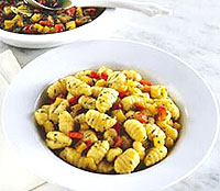 A paprikákat megmossuk, kicsumázzuk, félbevágjuk, kivágjuk az ereit, és a sütő grillrácsán vagy serpenyőben addig sütjük, amíg a héjuk teljesen megfeketedik. A fűszereket megmossuk, leszárítjuk, és felaprítjuk. Kis serpenyőben, 4 evőkanál olajban megpároljuk a zúzott fokhagymát, és megsózzuk, megborsozzuk. Hozzáadjuk a fűszereket, átkeverjük, és lefedjük. A megsült paprikák héját hideg víz alatt ledörzsöljük, a húsukat kis kockákra vágjuk, és belekeverjük a fűszeres mártásba. Ha szükséges, még sózzuk, borsozzuk. Forró sós vízben megfőzzük a gnocchit, leszűrjük, lecsöpögtetjük, tálba tesszük, és alaposan összeforgatjuk a mártással. Akkor a legfinomabb, ha azonnal tálaljuk.