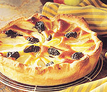 A vaníliarudat hosszában kettévágjuk, és 1 liter vízben 10 dkg porcukorral felforraljuk. A meghámozott, kimagozott almákat négyfelé vágjuk, a szirupba tesszük, és 5 percig főzzük. Az almákat kivesszük, lecsöpögtetjük, és negyedekre vágjuk. Kerek tortaformát sütőpapírral kibélelünk, és belesimítjuk a tésztát. A tojásokat a maradék cukorral, a vaníliáscukorral, a mandulával és a tejszínnel habosra keverjük, és a tésztára öntjük. Az almákkal és a szilvákkal a torta tetejét megrakjuk, és meleg sütőben készre sütjük. A formában hagyjuk kihűlni, majd grillrácsra borítjuk, és levesszük róla a papírt.