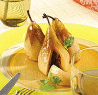 Hámozzuk meg a körtéket, de a felső részénél hagyjuk meg cikk-cakkosan a héját, hogy szebb legyen. A talpán át vegyük ki a magházat is. Egy fél liter vízbe tegyük bele a szegfűszeget, a fahéjat és a fehérbort, forraljuk egy negyed órát, majd öt percre tegyük bele főni a körtéket. Tegyük félre hűlni, és közben készítsük el a tölteléket: Keverjük el a vízben a mézet, a vaníliáscukrot és a reszelt citromhéjat, forraljuk fel, és öntsük a mazsolás dióra. Amikor kihűlt, óvatosan megtöltjük vele a körte belsejét. Az öntethez borostyánszínűre karamellizáljuk a cukrot, hirtelen felengedjük a vízzel, és addig forraljuk, míg a karamell el nem olvad. Állandó keverés mellett beleforraljuk az előkészített zselatint, és hagyjuk hűlni. Ebbe a krémbe néhányszor belemártjuk a körtét, hogy szép mázat kapjon. Különleges őszi desszert.