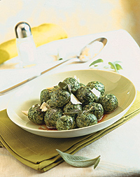A spenótot vízgőzben megpároljuk, lecsepegtetjük, és hozzákeverjük a fele vajban megpirított hagymához. Az egészet tálba tesszük, kihűtjük, és összekeverjük az összetört ricottával, az átszitált liszttel, a sajttal, a tojásokkal és a szerecsendióval. Megsózzuk, megborsozzuk, és alaposan összekeverjük. A keverékből gombócokat formázunk, meghintjük liszttel, és lisztezett tányérra tesszük. A gombócokat enyhén sós vízben megfőzzük, lecsepegtetjük, és rögtön tányérokra osztjuk. A zsályával kevert, megolvasztott vajjal körítjük, és meghintjük keménysajt-forgácsokkal.